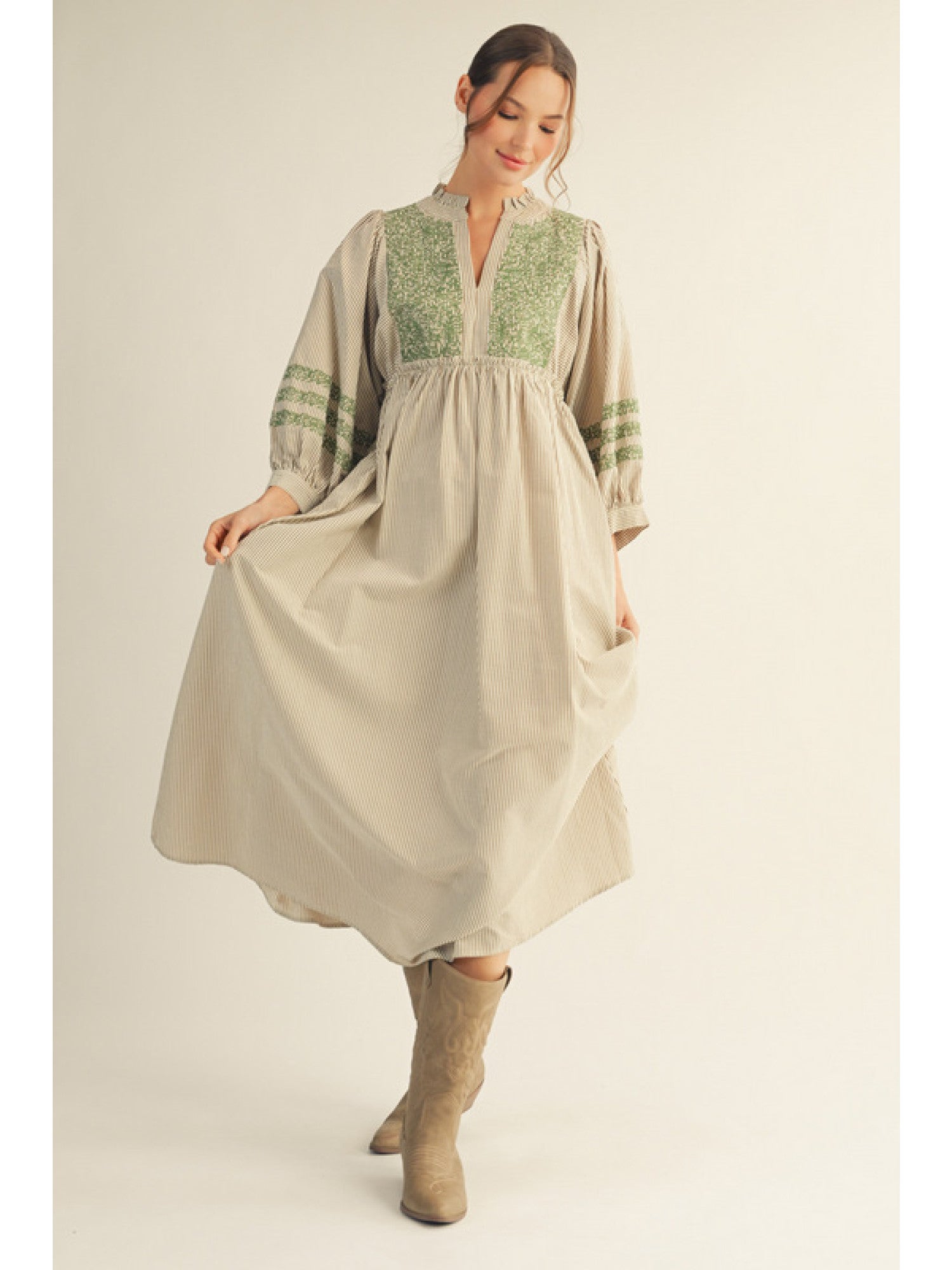 This midi dress features elegant 3/4 puff sleeves and a classic stripe pattern, enhanced by intricate embroidery details. The ruffled neckline adds a refined, feminine touch, making it suitable for both daytime outings and special occasions. Crafted to combine comfort and style, this dress delivers a sophisticated yet effortless look. Fabric content is 45% polyester, 45% cotton and 10% acrylic. The model is 5'10" and is wearing a size small.