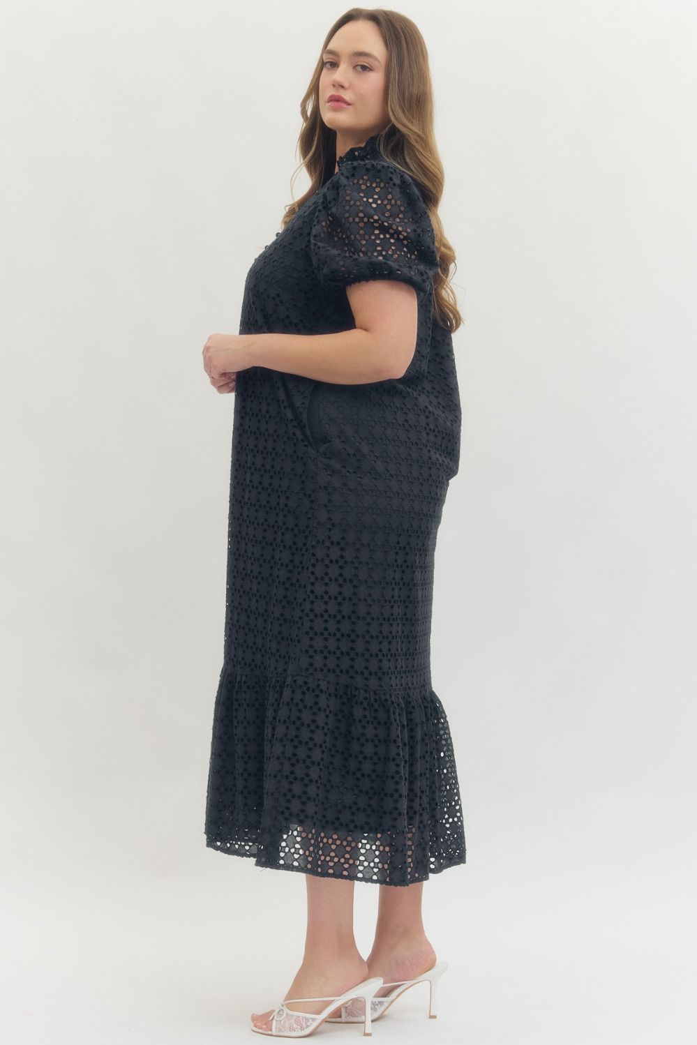Elevate your wardrobe with this charming eyelet midi dress, designed for effortless elegance. The delicate short puff sleeves and ruffled mock neck add romantic flair, while the matching ruffle hem creates a polished silhouette. Practical front button closure and hidden side pockets offer convenience without compromising style. Crafted from lightweight woven fabric with a non-sheer construction and lined interior, this dress transitions seamlessly from day to evening. Perfect for warm-weather occasions when you want to look put-together and feel comfortable.