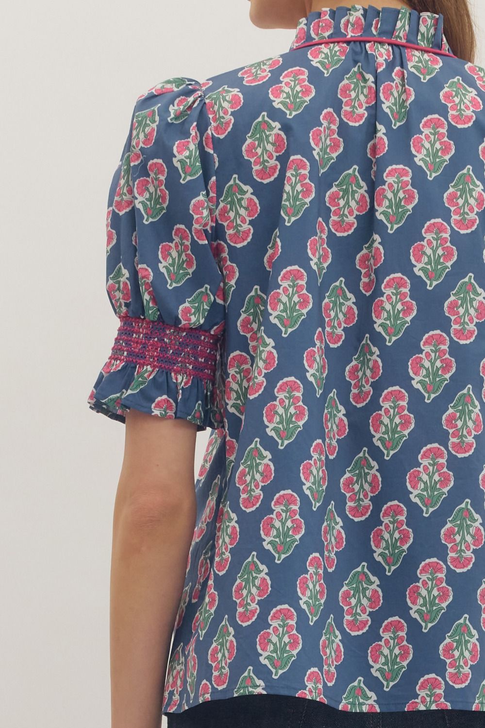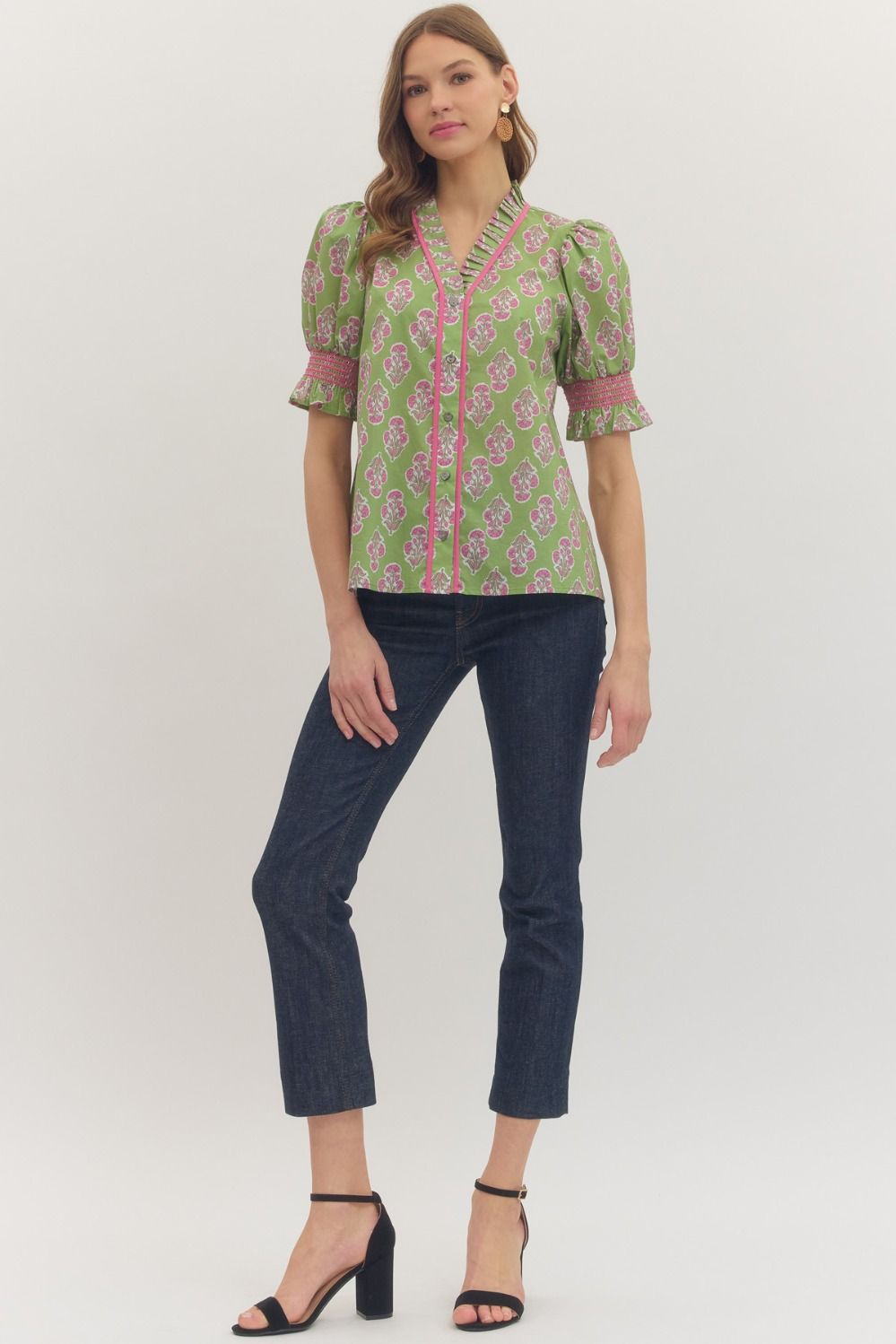 Elevate your wardrobe with this charming floral button-up featuring delicate short puff sleeves that add a touch of romance. The smocking detail on the cuffs provides texture and visual interest, while the ruffled-lined V-neckline creates a flattering silhouette. Contrasting piping along the edges offers a polished, tailored finish. Perfect for casual outings or dressing up with your favorite skirt or trousers, this versatile piece combines vintage-inspired details with modern style.